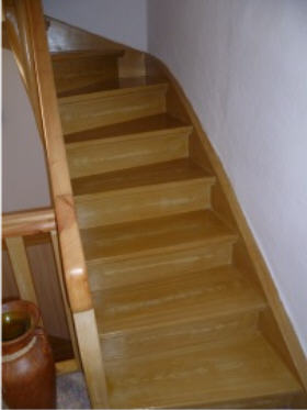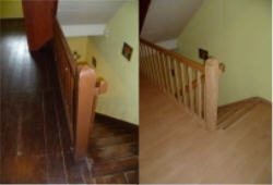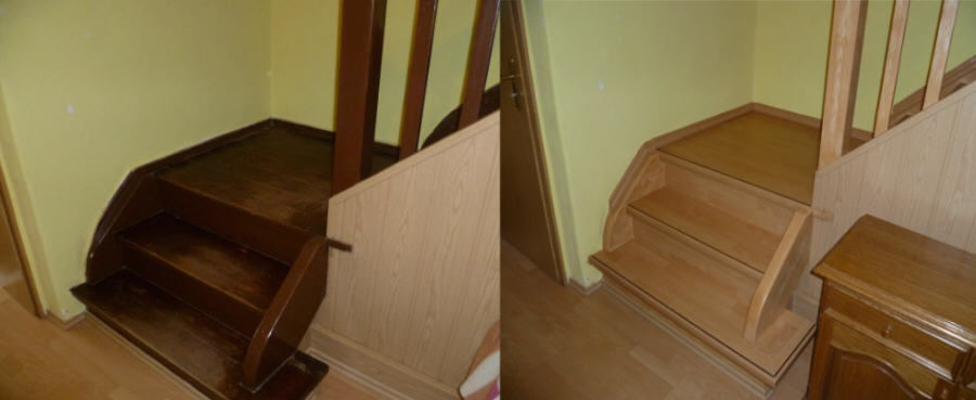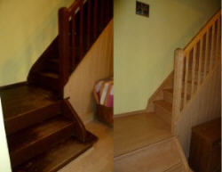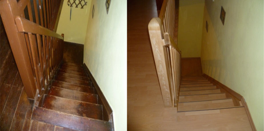 Aufgang alt und neu. Treppe mit Laminat bestückt und Geländer passent gemalt im Farbton. | |
