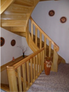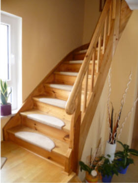 Handlauf und Trittstufen des Treppenaufganges sind aus Naturholz, restliche Treppe ist gemahlt |
